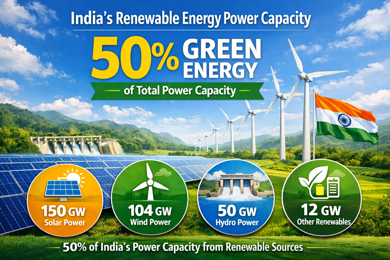 ಭಾರತದಲ್ಲಿ ನವೀಕರಿಸಬಹುದಾದ ಇಂಧನಕ್ಕೆ ಭಾರೀ ಉತ್ತೇಜನ: ಒಟ್ಟು ವಿದ್ಯುತ್ ಸಾಮರ್ಥ್ಯದಲ್ಲಿ 50% ಕ್ಕಿಂತ ಹೆಚ್ಚು ಹಸಿರು ಶಕ್ತಿ